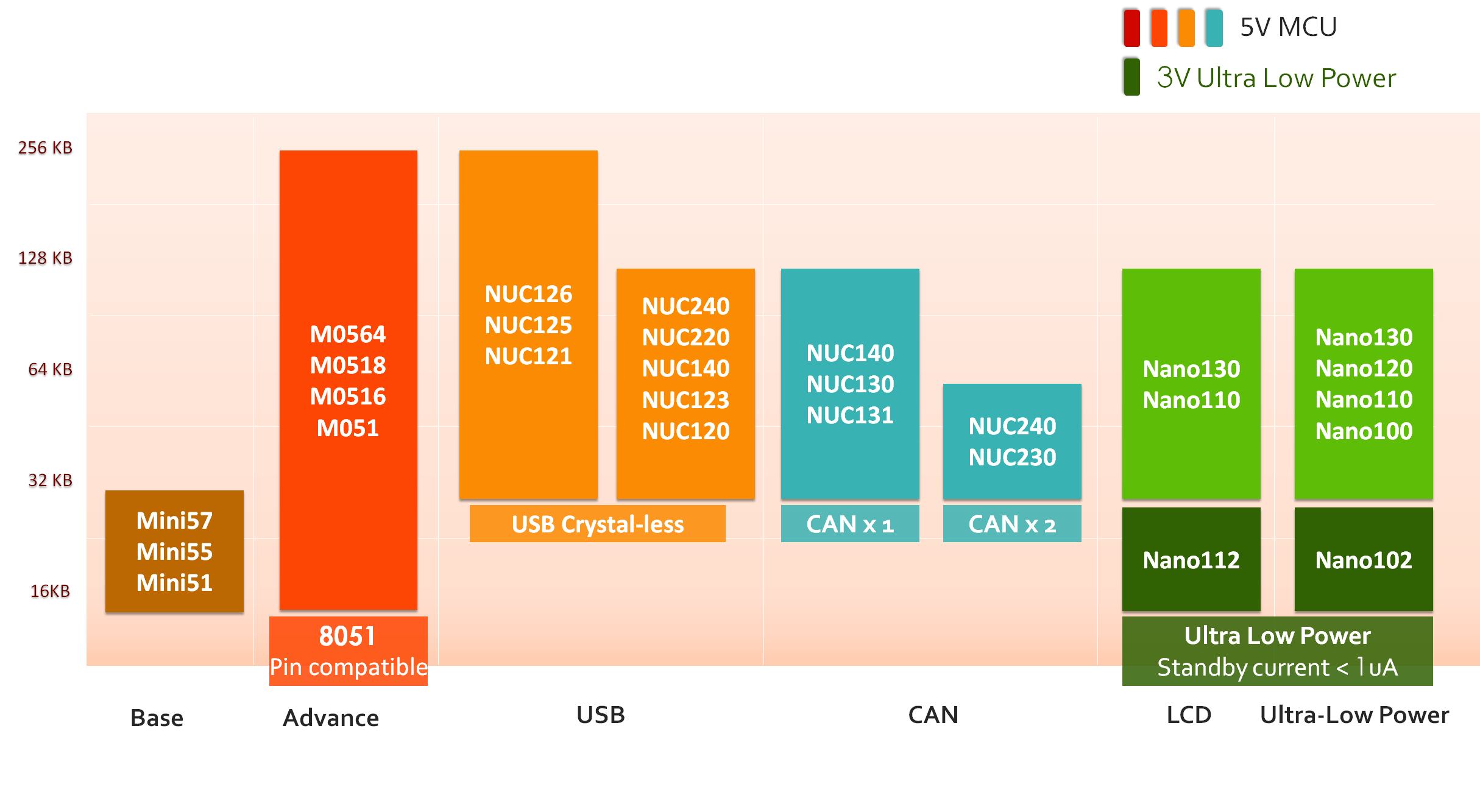 - Nano series (Nano100/110/120/130/102/112/103) is Ultra-low power with supply voltage from 1.8V to 3.6V, less than 1uA stand by current, incorporating the LCD driver (4x40 & 6x38) as well as independent power source for RTC (VBAT)